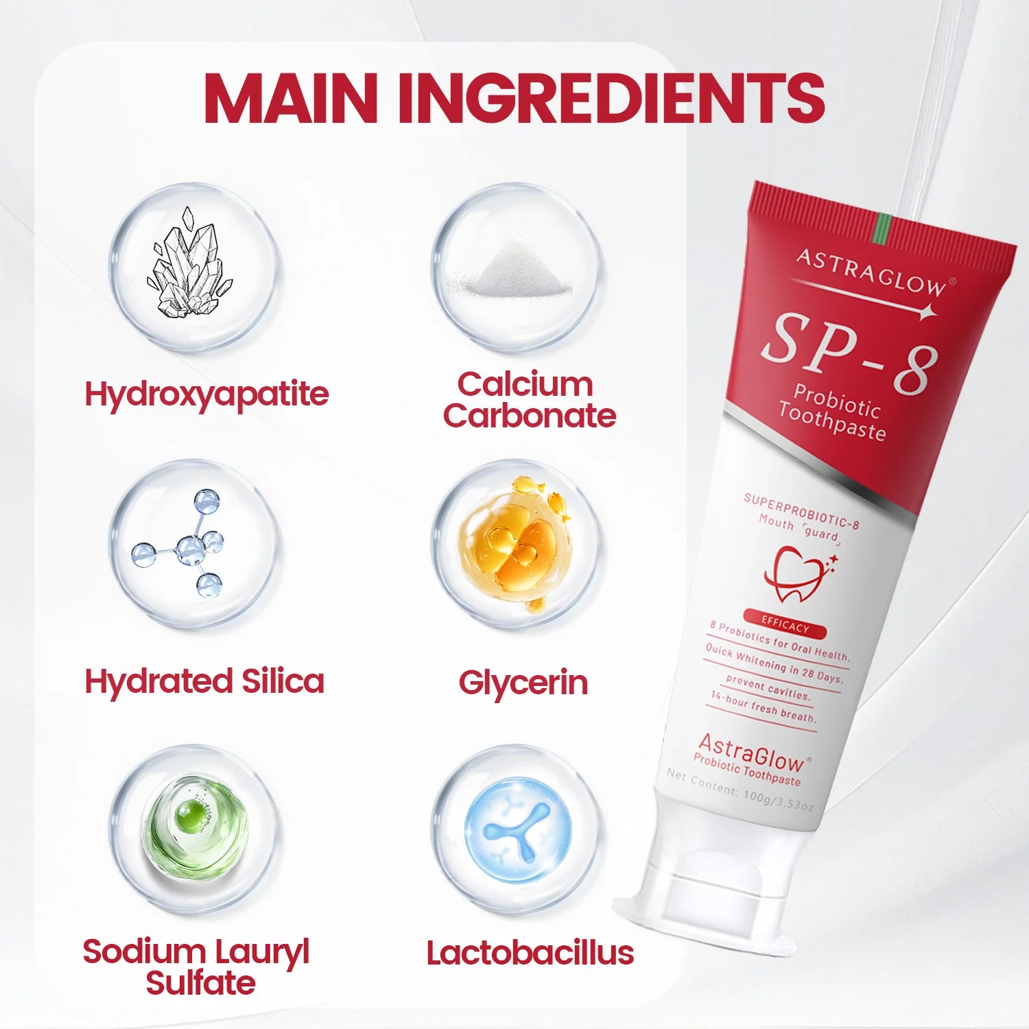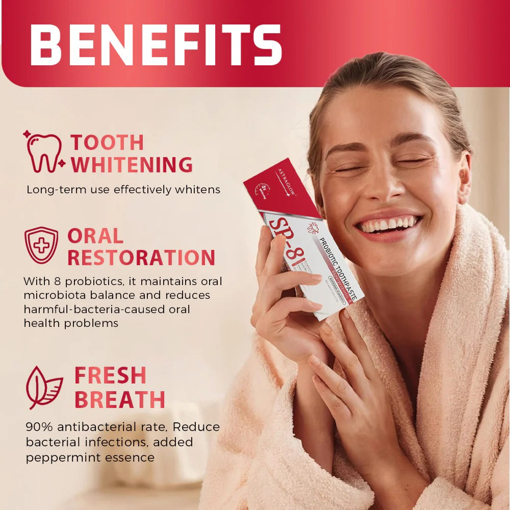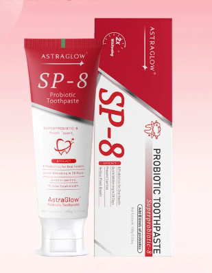 SP-8 Probiotic Toothpaste combines whitening and protection in one. Calcium carbonate removes yellow stains, while hydrated silica prevents cavities and forms a protective film to block pigments from coffee, wine, and more. Plant antioxidants create a 24-hour anti-yellow barrier, keeping teeth bright. With 8 probiotics to balance the oral microbiome, plus 90% antibacterial power and refreshing peppermint, SP-8 delivers complete oral care—whitening, enamel protection, and long-lasting fresh breath.